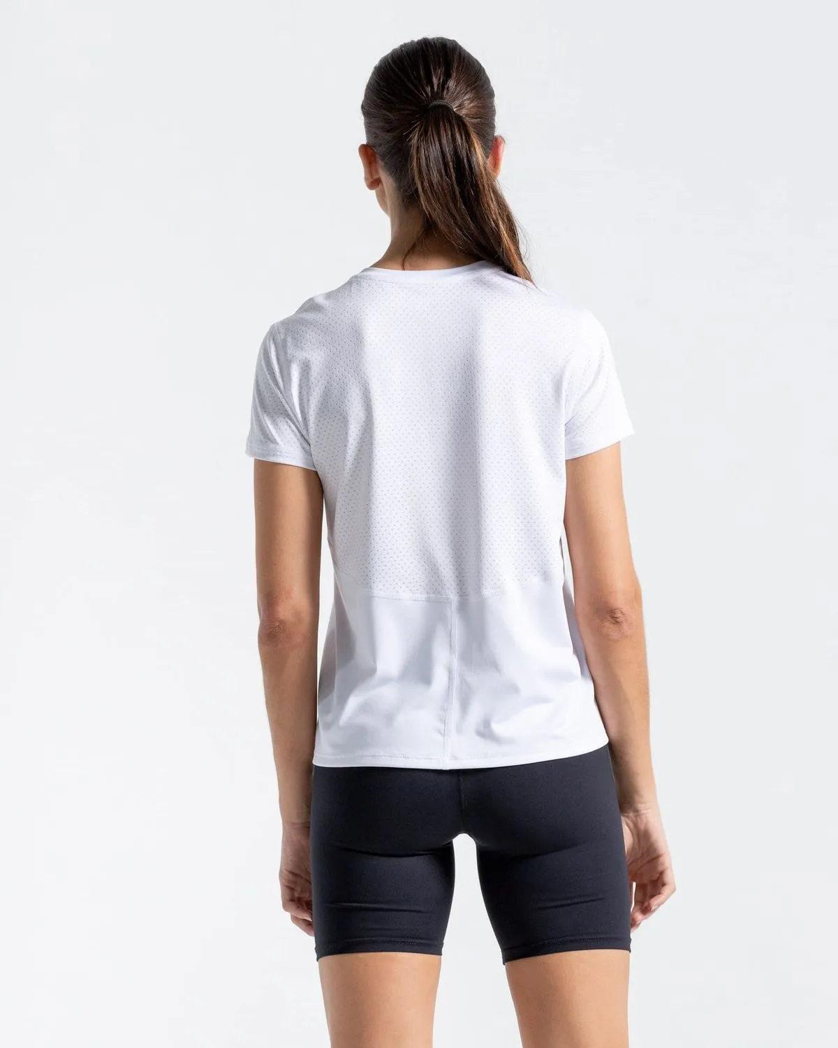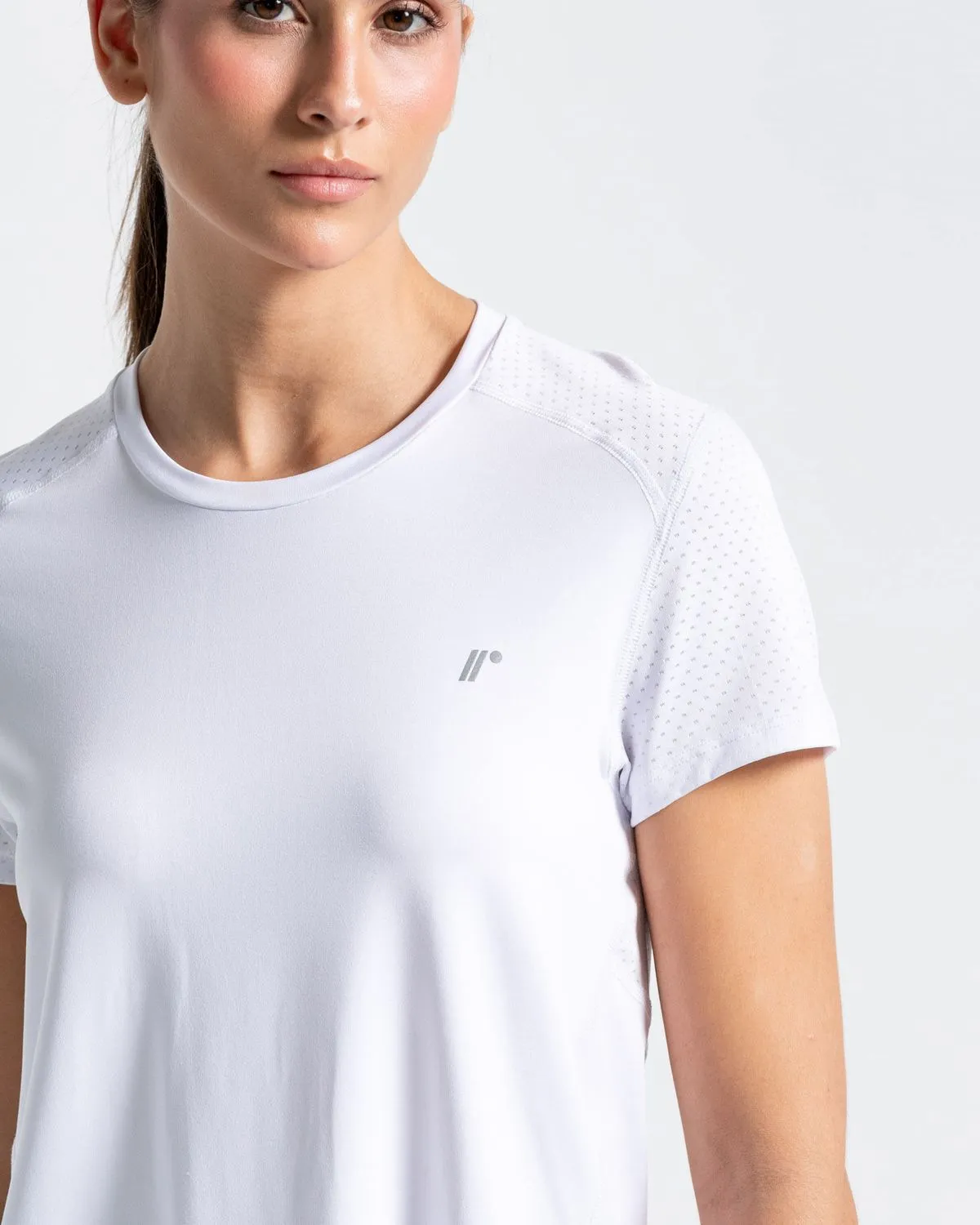 Confeccionada en poliéster con elastano, brinda elasticidad, ligereza y confort. Las costuras planas reducen el roce, el aplique reflectivo mejora la visibilidad en condiciones de poca luz y la protección UV la convierte en una excelente opción para entrenamientos al aire libre. El color blanco aporta un estilo limpio y versátil, fácil de combinar.