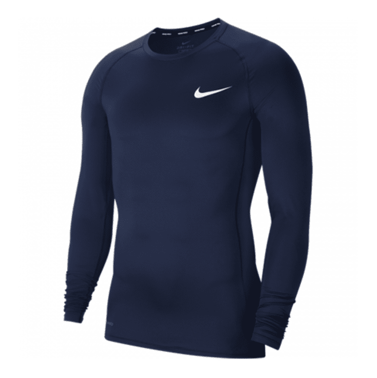 Camibuso Nike azul oscuro de manga larga: ideal para entrenamientos intensos. Tejido ajustado y tecnología Dri-FIT que mantiene el cuerpo seco y cómodo.