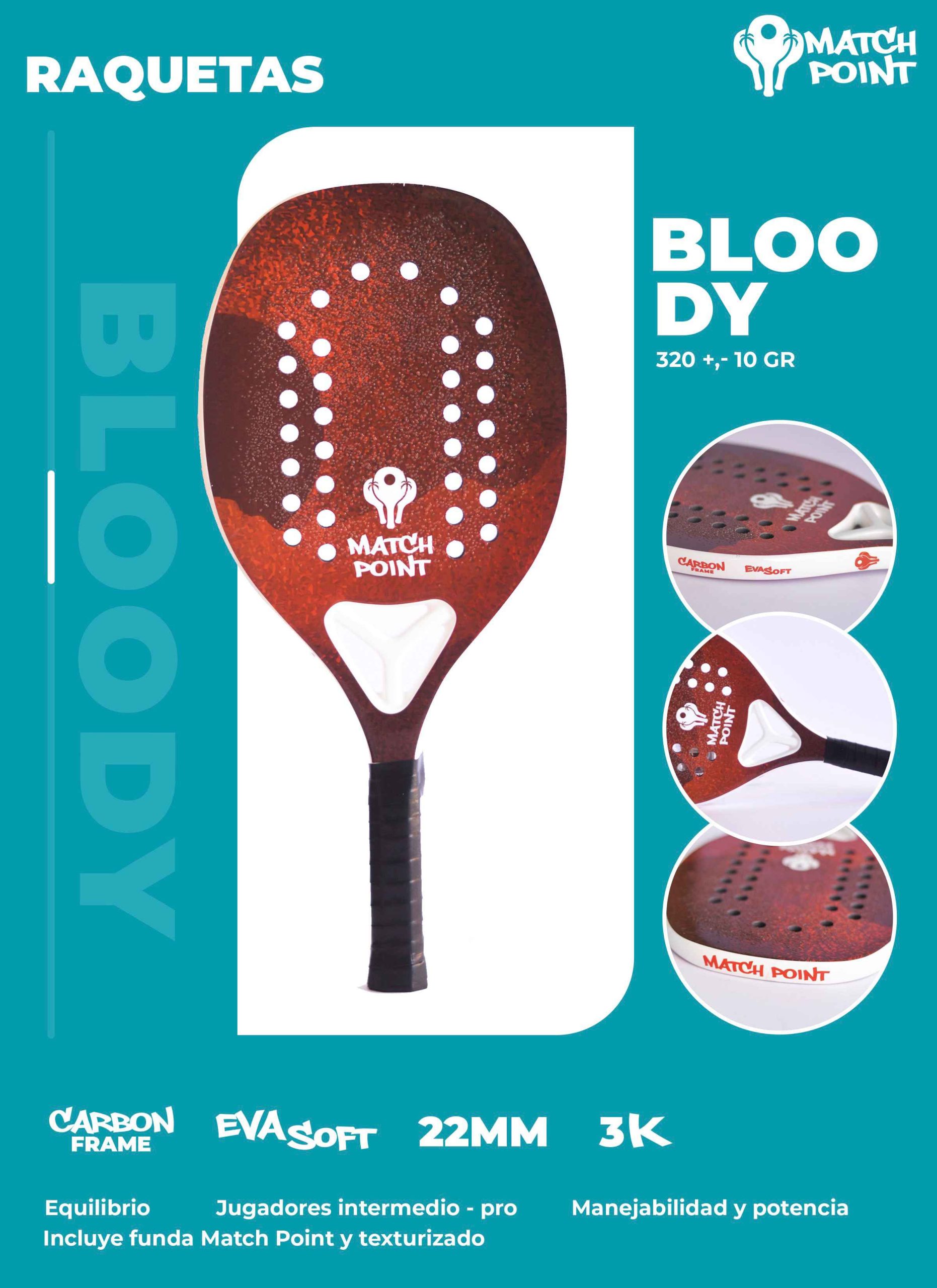 La Match Point Bloody es una raqueta ideal para quienes buscan equilibrio entre potencia, control y maniobrabilidad. Fabricada con carbono 3K y núcleo EVA Soft, ofrece una sensación cómoda al golpear y una respuesta firme en los momentos clave del partido.
